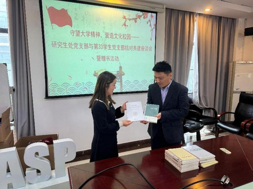 为深入开展学习贯彻习近平新时代中国特色社会主义思想主题教育,进一步进一步推动校园书香文化建设,活跃校园文化生活,营造浓郁文化氛围。2024年11月14日,上政第33学生党支部与结对共建研究生处党支部举办了以“守望大学精神,营造文化校园”为主题的经验交流座谈会。