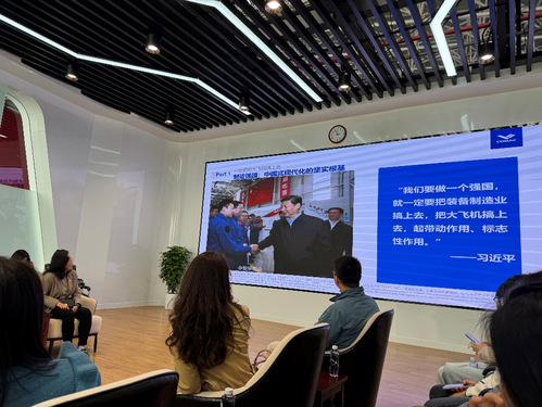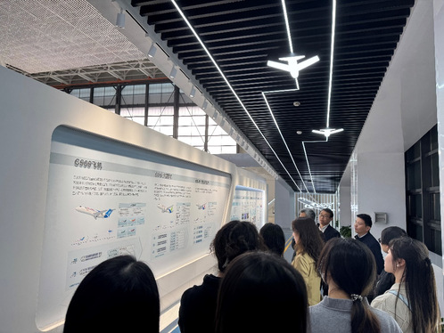 随后,党员师生们来到会议厅,聆听研究院工作人员对中国商飞集团发展历程的深入剖析。期间,大家一同观看习近平总书记2014年视察中国商飞的珍贵纪实影像。习近平总书记的殷切嘱托,不仅体现党中央对航空事业的高度重视,更为中国商飞的发展指明方向。中国商飞始终将习近平总书记指示作为行动指南,在党建引领下,坚持 “生命至上,安全第一”,通过思想、责任、行动、监督 “四个引领”,全力保障大飞机质量安全,推动项目攻坚取得重大突破。2023 年,C919 成功实现商业首航,ARJ21 完成海外首航,展现中国航空工业的雄厚实力与卓越成就。