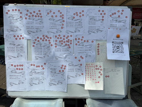 活动筹备期间共收集了20份原创诗歌作品,经选拔部分优秀作品于5月13日在青马广场展出。活动过程中同学们纷纷驻足欣赏,为心仪的作品投出手中的一票,也有一些同学在活动现场创作诗歌并同步展出。现场进行了一场长线程的诗词“飞花令”,贯穿整场活动,来自各个学院近百余位同学参与,共同感受春日文气。