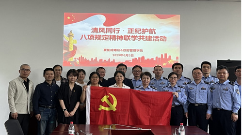 6月3日下午,政府管理学院教工第二支部与上海市夏阳戒毒所政工党支部开展了“清风同行·正纪护航”——中央八项规定精神联学共建活动,会议由教工第二支部书记庞娇艳主持。夏阳戒毒所党委委员、纪委书记潘爱华与夏阳强制戒毒所党委委员张克帅,政府管理学院党委书记姚善英、院长汪伟民、学生工作负责人杨铠出席会议。