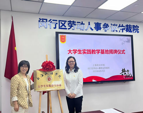 为赋能法治人才培养,深化实践育人,让学生在实务场景中锤炼专业能力、增强社会责任感,6月25日上午,政府管理学院教师罗小娟赴闵行区劳动人事争议仲裁院访企拓岗,双方举行“大学生实践教学基地”挂牌仪式并座谈交流。闵行区劳动人事争议仲裁院院长杨琦和院其他领导及庭长等九位出席座谈会,正在闵行仲裁院进行夏季学期专业实习的五名上政学子也一起参加了座谈会。