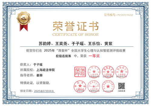 近日,在第三届全国大学生心理与行为在线实验精英赛中,我院心理学专业组建的参赛队伍,依托学院重点建设的心理学学科优势,凭借扎实的专业基础、贴合社会治理场景的实验设计与高效的团队协作,从省内外众多参赛队伍中脱颖而出,荣获一等奖,成功晋级分区赛