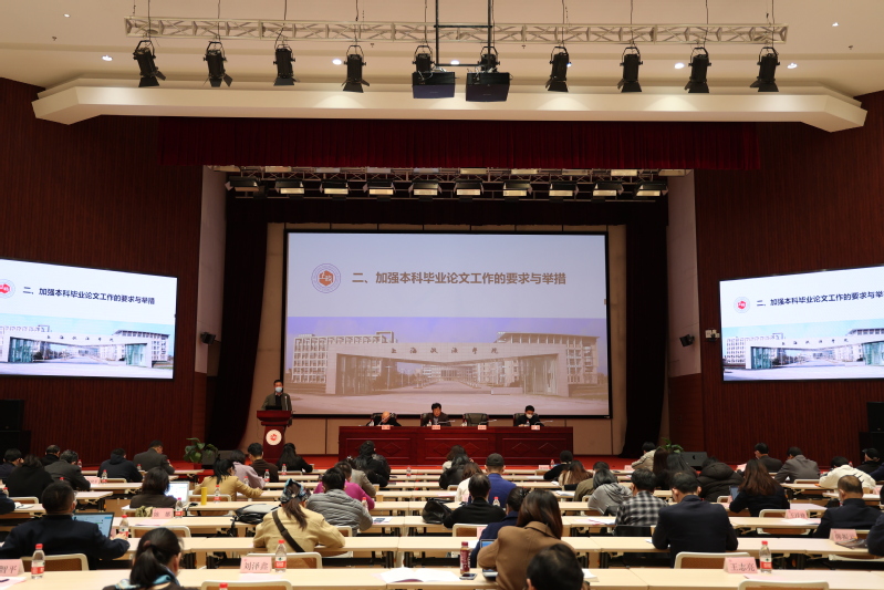 教务处袁胜育以本科毕业论文的问题、论文指导过程中的问题为切入点,提出学校加强本科毕业论文工作的要求与举措。袁胜育表示,各二级学院要把学术论文撰写训练融入学生本科学习的全过程,抓紧抓早;要进一步提高论文管理水平,严格落实论文开题、写作、答辩等过程中的各项要求,确保毕业论文质量。