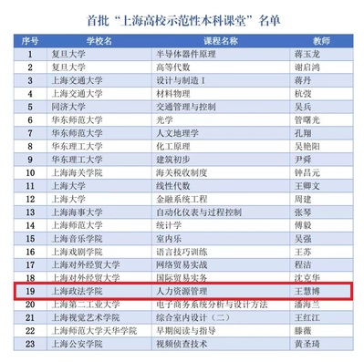 近日,市教委下发了《上海市教育委员会关于公布首批“上海高校示范性本科课堂”名单的通知》(沪教委高〔2023〕10号),我校政府管理学院王慧博教授的《人力资源管理》课程成功入选上海市首批“上海高校示范性本科课堂”。
