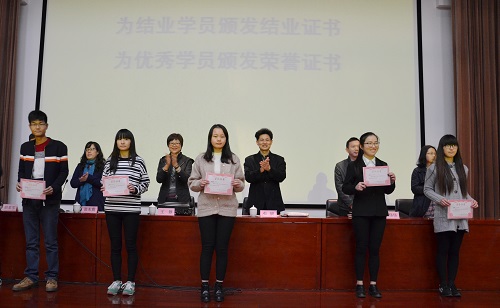 典礼上,党委组织部、统战部部长王静宣读了优秀学员名单。出席的各位领导给学员颁发了结业证书和优秀学员荣誉证书。本期培训班共有312名学员通过培训班考核并顺利结业。按照“优秀学员”评选标准,此次培训班共评选出了22位优秀学员。来自社会管理学院的优秀学员代表蔡虹同学代表全体学员作了发言。