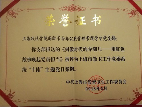 近日,上海市教卫工作党委举行了基层党建工作特色项目(案例)交流展示会,对获奖的组织生活案例、主题党日案例和基层党建特色项目进行了表彰和展示。我校党委组织部推荐的国际事务与公共管理学院学生党支部主题党日活动“勇做时代的弄潮儿——用红色故事唤起党员担当”荣获教卫系统“十佳”组织生活案例并进行了现场展示。