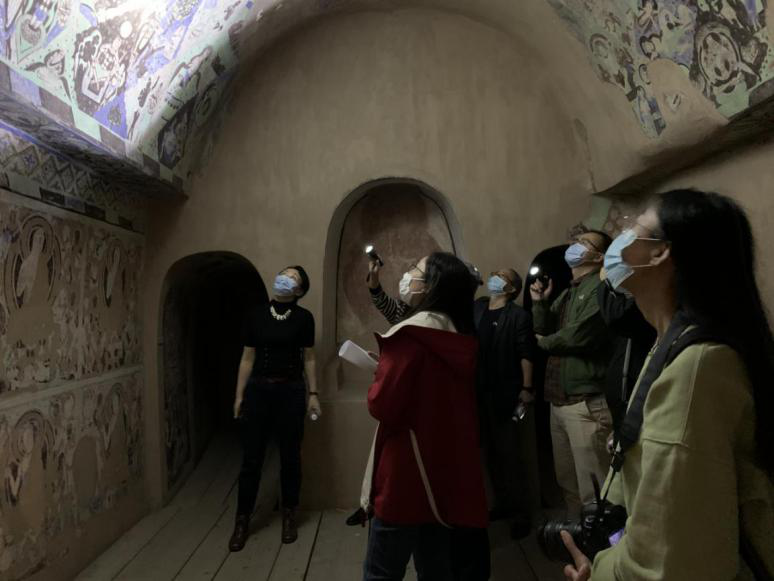在讲解员的带领下,大家参观了龟兹洞窟,龟兹壁画中灵动逼真的飞天人物,极具异域色彩的佛教故事都深深地吸引了大家。此洞窟是应用3D打印技术1:1还原的高仿真作品,体现了3D打印与数字印刷技术在文物复制方面的创新应用。