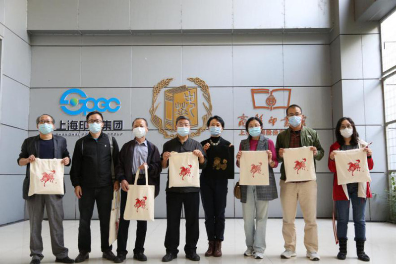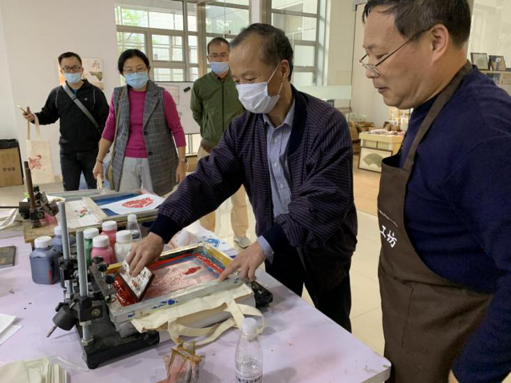 最后,社员们在印刷互动工作室中体验了丝网印刷帆布包工艺。博物馆的老师傅详细地讲解了每个步骤,从颜色搭配、颜料配比到按压时的力度与角度都有讲究。在老师傅的指导下,大家都完成了一份令自己满意的作品。