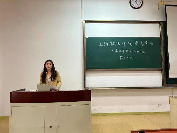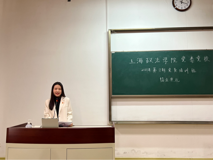 赖洁珊宣读了本期培训班优秀学员名单;刑事司法学院关梓圻同学作为优秀学员代表发言,表示通过此次培训班的学习,会更加积极学习党史,不忘来时路;学习革命精神,严守党的纪律;谨记使命担当,不负韶华、不负时代,为党和国家奉献青年力量。