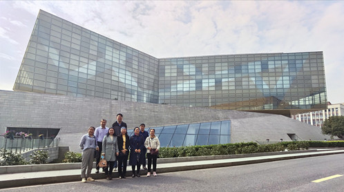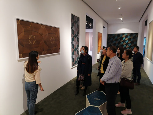 我校一行参观了总部基地、美学创意园区、中国地板博物馆等。在参观过程中,胡玉姣介绍了书香门地结合艺术、文化、时尚、美学、哲学与心理学进行研究,对地板的肌理、色彩和图案进行创作,将木材纹理本身的美感和绘画、音乐、建筑等各类艺术进行“互文式”的演绎,打造“让每个生活空间都成为艺术殿堂”的理念。