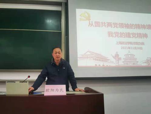 人工智能法学院党总支书记欧阳为民为同学们进行了第二节讲座——《从国共两党领袖的精神境界看我党的建党精神》。欧阳书记从国共两党领袖面临危险时选择的对比切入,主要从四个方面阐释了建党精神的深刻内涵:坚持真理、坚守理想;践行初心、担当使命;不怕牺牲、英勇斗争;对党忠诚、不负人民。欧阳书记强调,在生死关头、重大利益、重大事件、重大挑战面前,最能考验党员的政治觉悟,最能体现出党员的精神境界。大学生党员要用理论武装头脑,提高思想觉悟,坚持党员的底线。