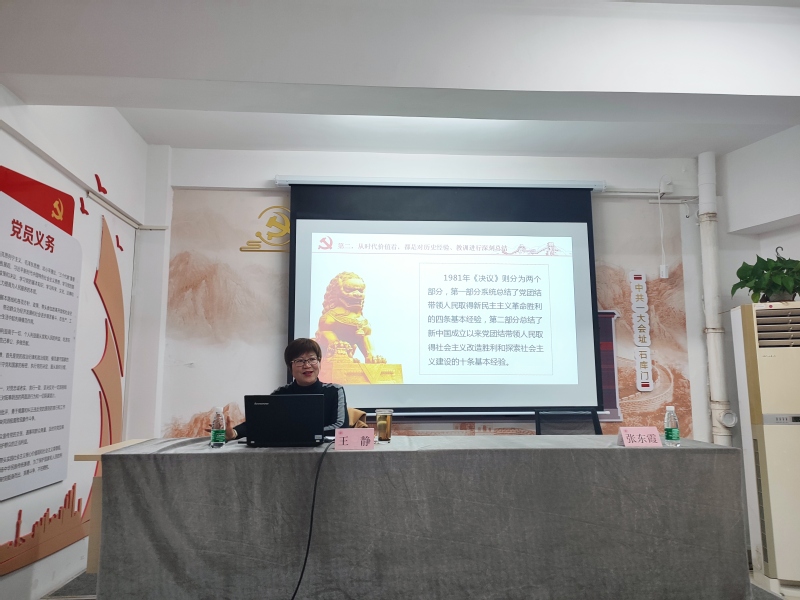 王静以“牢记初心使命的政治宣言”为主题,从四个方面作了讲解分享:一是三个决议的历史意义。从历史方位、时代价值、政治意义、思想导向四个层面进行了概括总结,指出六中全会的决议也必将推动全党增长智慧、增进团结、增加信心、增强斗志。二是关于六中全会的主要内容。用数字进行了形象概括,并对确立习近平同志党中央的核心、全党的核心地位,确立习近平新时代中国特色社会主义思想的指导地位进行了重点讲解。三是从科学性和党性、唯物史观和正确党史观、实事求是和与时俱进三个辩证统一的角度分享了学习体会。四是从理论、政治、实践三个逻辑,重点讲述如何落实全会精神,提出要从“勤充电、强本领、谋发展、接地气、守底线”五个方面进一步提升能力。